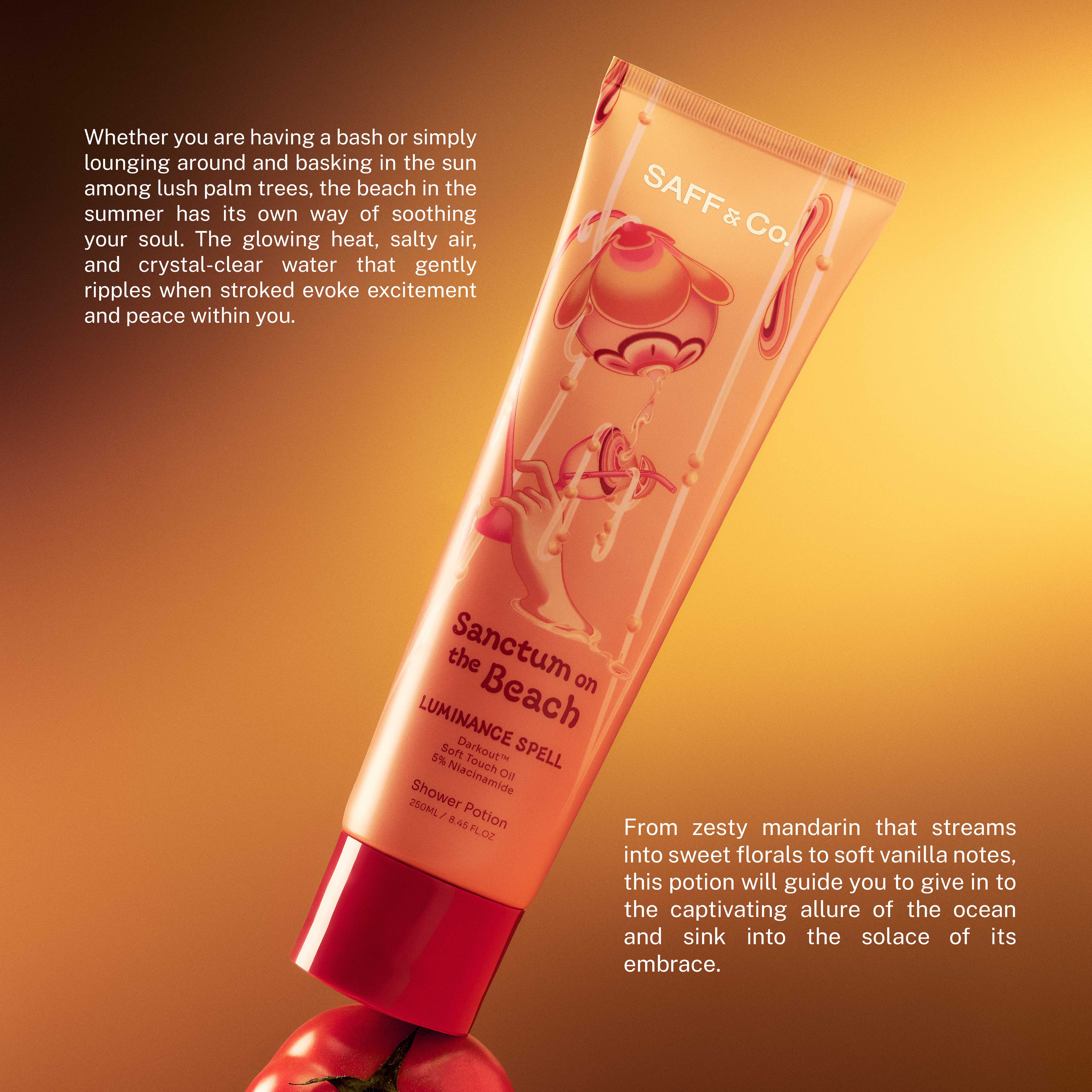 Whether you are having a bash or simply lounging around and basking in the sun among lush palm trees, the beach in the summer has its own way of soothing your soul. The glowing heat, salty air, and crystal-clear water that gently ripples when stroked evoke excitement and peace within you. From zesty mandarin that streams into sweet florals to soft vanilla notes, this potion will guide you to give in to the captivating allure of the ocean and sink into the solace of its embrace.